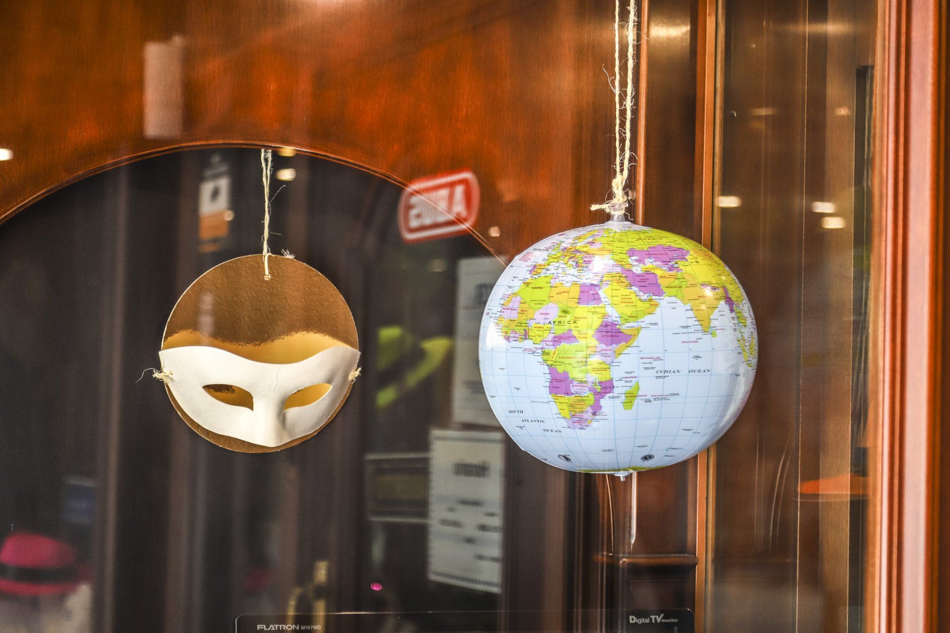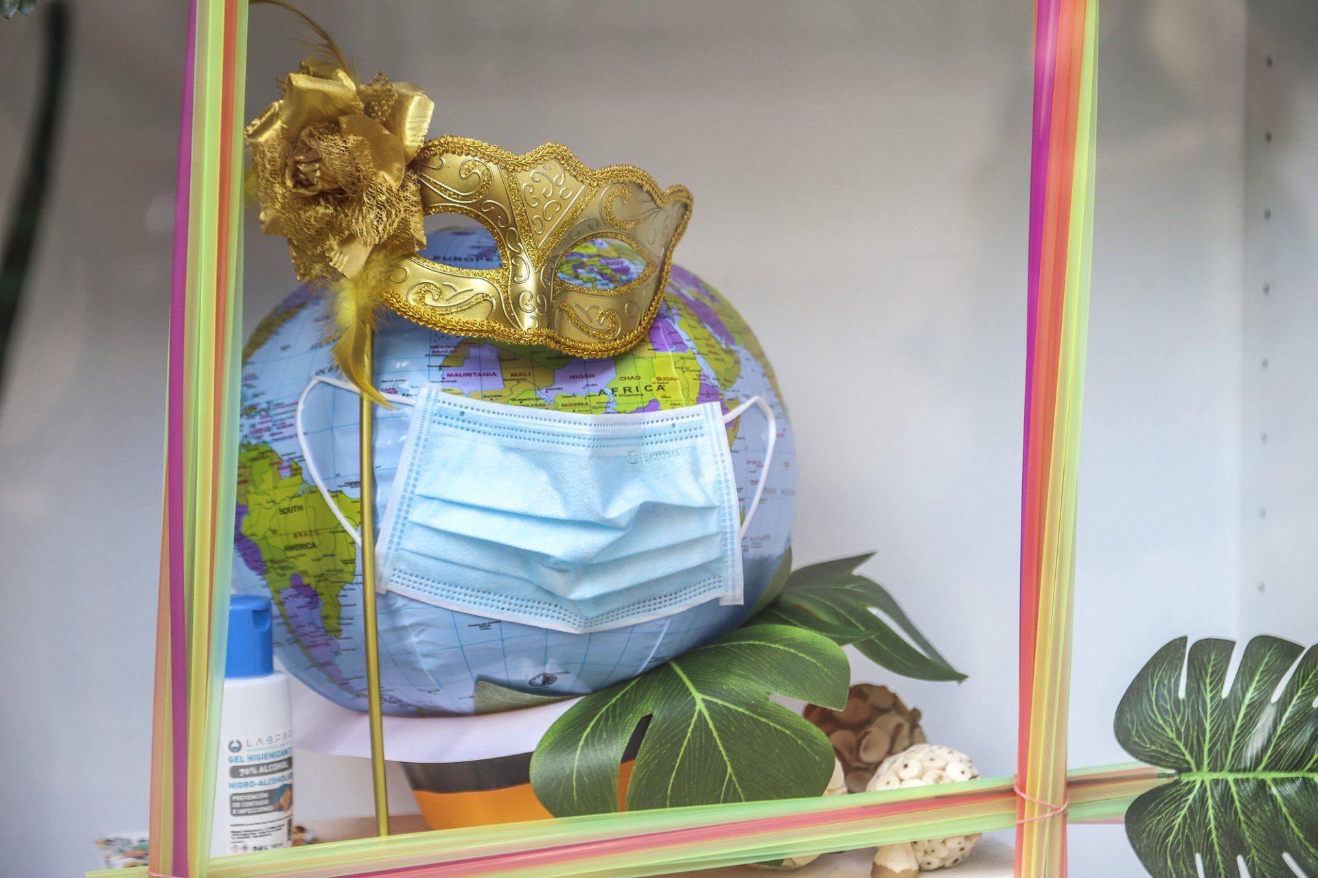 -El mensaje del maniquí, avisando que tenemos el mundo en nuestras manos y que hemos de prevenir contagios.