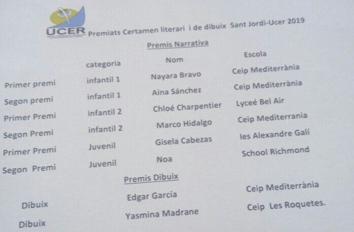 Noms dels guanyadors del certamen literari i de dibuix Sant Jordi-Ucer 2019