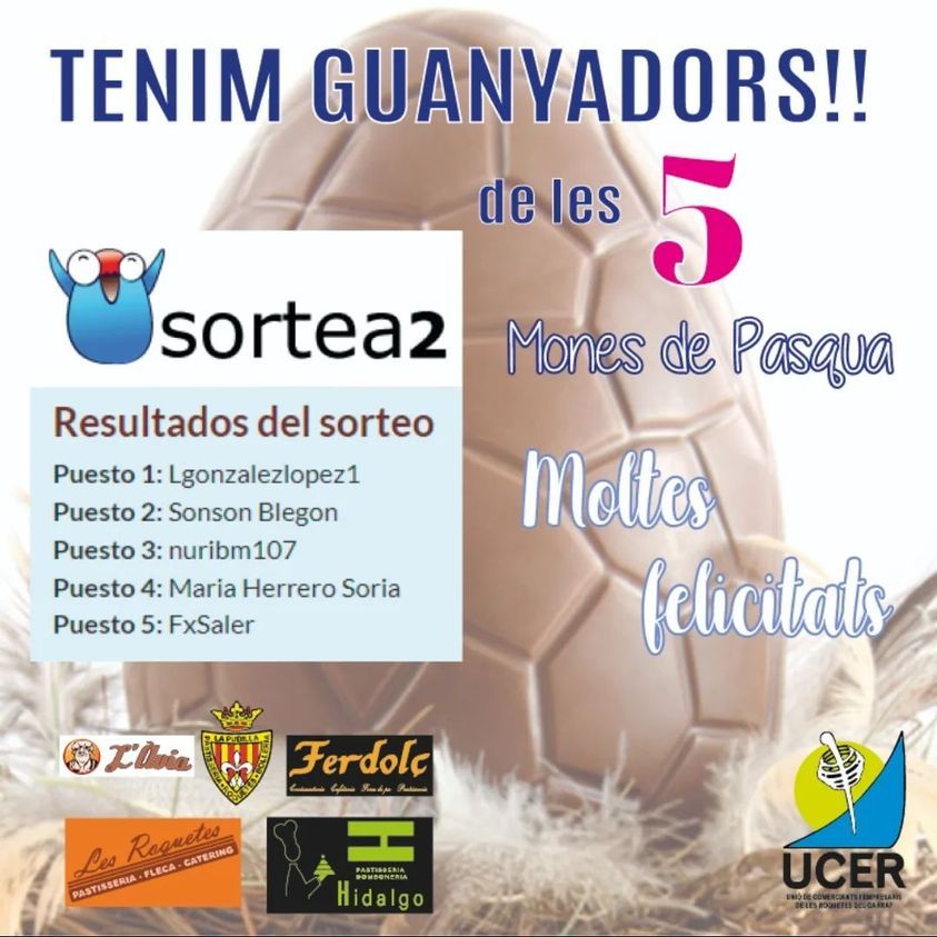 Els nostres socis Ferdolç, Forn de l'àvia, La Pubilla, Pastisseria Les Roquetes i Pastisseria Hidalgo aporten una mona de Pasqua cadascú per aquest sorteig.